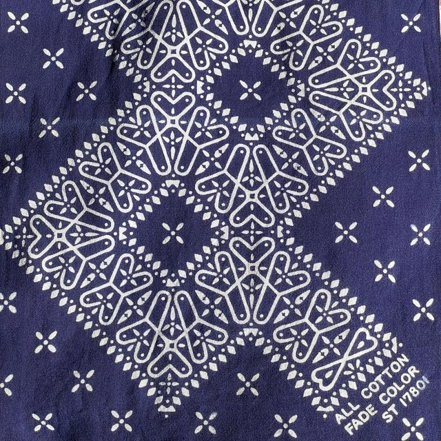 こちらは先行予約分で、発送は11月5日以降に順次いたします。 同時にご注文いただいた商品も予約品が揃い次第発送いたしますのでご了承ください。 キャンセルは承れませんので予約商品である旨ご確認の上ご注文をお願いいたします。 ※2025年11月8日再販開始 クロスバンダナ2.0です. 弊社品番1号のロングセラー柄です。 古着市場では定番柄のクロスバンダナを手ぬぐいサイズに落とし込み,新たな印象にアップデートしました. 注染という手ぬぐいで用いる染め方をしており,使って洗ってを繰り返すごとに色が褪せ,風合いが柔らかくなります. ハンカチとして,ガンガン使ってデニムのように楽しんでいただけます! カラー:ネイビー サイズ:約34㎝×約100㎝(両端切りっぱなしのため前後します) 原産国:日本 組成:綿100% ※最初の数回は洗濯の際に色落ち,色移りする可能性がありますので,白いもの,淡色とは分けて洗うか,手洗いをおすすめします. ※注染の特性として,にじみや歪みが部分的にあるなど,個体差があります. 濃色の場合火薬のようなにおいがありますが,洗濯を繰り返すうちに弱まり気にならなくなります. 顔料染めやシルクスクリーンにはない味わいを出したいため注染で製作しており,個体差も商品の魅力として提案しております.
