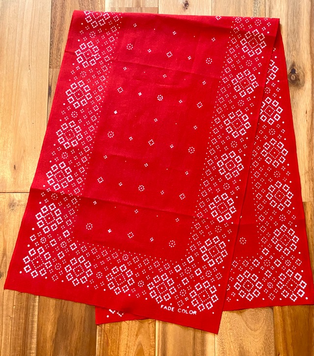 2026年1月1日リリース ※こちらは手ぬぐいが2本分繋がった状態のものをストールサイズとしてご案内している商品です 今回の赤は洗うと激しく赤い色が出るので、着用や洗濯の際の移染には充分なご注意のうえでご利用ください 注染手ぬぐい『RHOMBUS』レッドです。 28作目の新柄『RHOMBUS』はこれまでの主張の強いオールドバンダナモチーフ柄に対して、やや貧弱とも取れる繊細な雰囲気を意識して製作しました。 RHOMBUSとは菱形を意味する言葉で、同じ意味のダイヤモンドより幾何的な、より形状にフォーカスしたニュアンスを持つこの言葉を用いました。 今回の新柄のために、80年台のアメリカ製トランプのパッケージを基に専用のラベルも作成しました。 渾身のデザインを皆さまに是非まじまじとご覧いただきたいです。 注染で表現出来るギリギリのドットサイズで、菱形をモチーフに王道バンダナ構図で仕上げました。 今回の図案は完全オリジナルでゼロから作成しております。 所々ドットが滲んだり歪んだり…それを考慮したドットサイズで染めのイレギュラー感を魅力として付加したいと思ってのことなので、一枚一枚異なる不確定要素としてポジティブに受け取っていただけましたら幸いです。 注染という手ぬぐいで用いる染め方をしており,使って洗ってを繰り返すごとに色が褪せ,風合いが柔らかくなります. 様々な用途で,ガンガン使ってデニムのように楽しんでいただけます! カラー:レッド ※この赤は洗濯の際にとても色が出るため、白や淡色のものと一緒に洗うと間違いなく移染します。 しばらくは単体で手洗いしていただくと様子がうかがえるのでおすすめです。 サイズ:約34㎝×約200㎝(両端切りっぱなしのため前後します) 原産国:日本 組成:綿100% ※最初の数回は洗濯の際に色落ち,色移りする可能性がありますので,白いもの,淡色とは分けて洗うか,手洗いをおすすめします. ※注染の特性として,細かな点,にじみや歪みが部分的にあるなど,個体差があります. 顔料染めやシルクスクリーンにはない味わいを出したいため注染で製作しており,個体差も商品の魅力として提案しております.