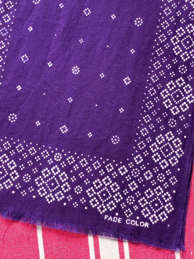 2026.2.20 release SEGAL別注 Exclusive手ぬぐいストール⑤ ※弊社オンライン、SEGAL鎌倉店ともに完売で今後の催事での販売はありません こちらは手ぬぐいが2枚繋がったままの状態でストールサイズとしてご提案しております 200センチありますので巻き方も様々アレンジしていただけます ※ストールサイズはご用意数が少なく、極少量のご案内となります。 ※SEGAL鎌倉店での販売開始は11日です 神奈川県藤沢市で1988年創業の老舗古着屋SEGAL様からご用命いただき、3年前の2023年2月に鎌倉は長谷に新たにOpenしたSEGAL鎌倉の完全別注手ぬぐいを3周年記念として製作しました。 そのSEGAL鎌倉の店主、廣川様にご用意いただいたオールドバンダナを基に細部に渡るまで修正を繰り返しながら、注染で再現可能な限界にチャレンジして雰囲気を重視した傑作です。 SEGAL鎌倉店でのみ販売予定でしたが、遠方の方やご来店が難しい方を考慮して弊社オンラインとの2拠点限定で販売いたします。 縫製前未裁断のバンダナが生地のまま3枚分繋がった状態をイメージしています。 端の文字部分もインラインの手ぬぐいよりもサイズを小さ、,文言も極力少なくしてシンプルなものを目指しました。 ちなみに「FADE COLOR」はオールドバンダナに見られる堅牢という意味でのFAST COLORになぞらえて、あえて色落ちをポジティブに表現する意味で表記した造語で、注染の味わい深いフェード感をお楽しみいただくために大事にしている言葉です。 注染というのは古くから手ぬぐいで用いられる染め方で、この技法で染められた手ぬぐいは使って洗ってを繰り返すごとに色が褪せ、風合いが柔らかくなります。 様々な用途でガンガン使ってデニムのように楽しんでいただけます! ハンカチ、手拭きとしての用途意外にもリングやブローチ、ピンで留めて首に巻くスタイルがおすすめです。 そして今回は同じく3周年を記念して作ったピンバッジをオプションで購入できますので、こちらも合わせてご注文いただけましたら幸いです。 カラー:ネイビー サイズ:約34㎝×約200㎝(両端切りっぱなしのため前後します) 原産国:日本 組成:綿100% ※最初の数回は洗濯の際に色落ち,色移りする可能性がありますので,白いもの,淡色とは分けて洗うか,手洗いをおすすめします. 洗濯の条件や乾燥方法,使用頻度等で色落ちの雰囲気は十人十色です.文中の色落ち感の説明は参考程度にご理解ください. ※注染の特性として,にじみや歪みが部分的にあるなど,個体差があります. 顔料染めやシルクスクリーンにはない味わいを出したいため注染で製作しており,個体差も商品の魅力として提案しております