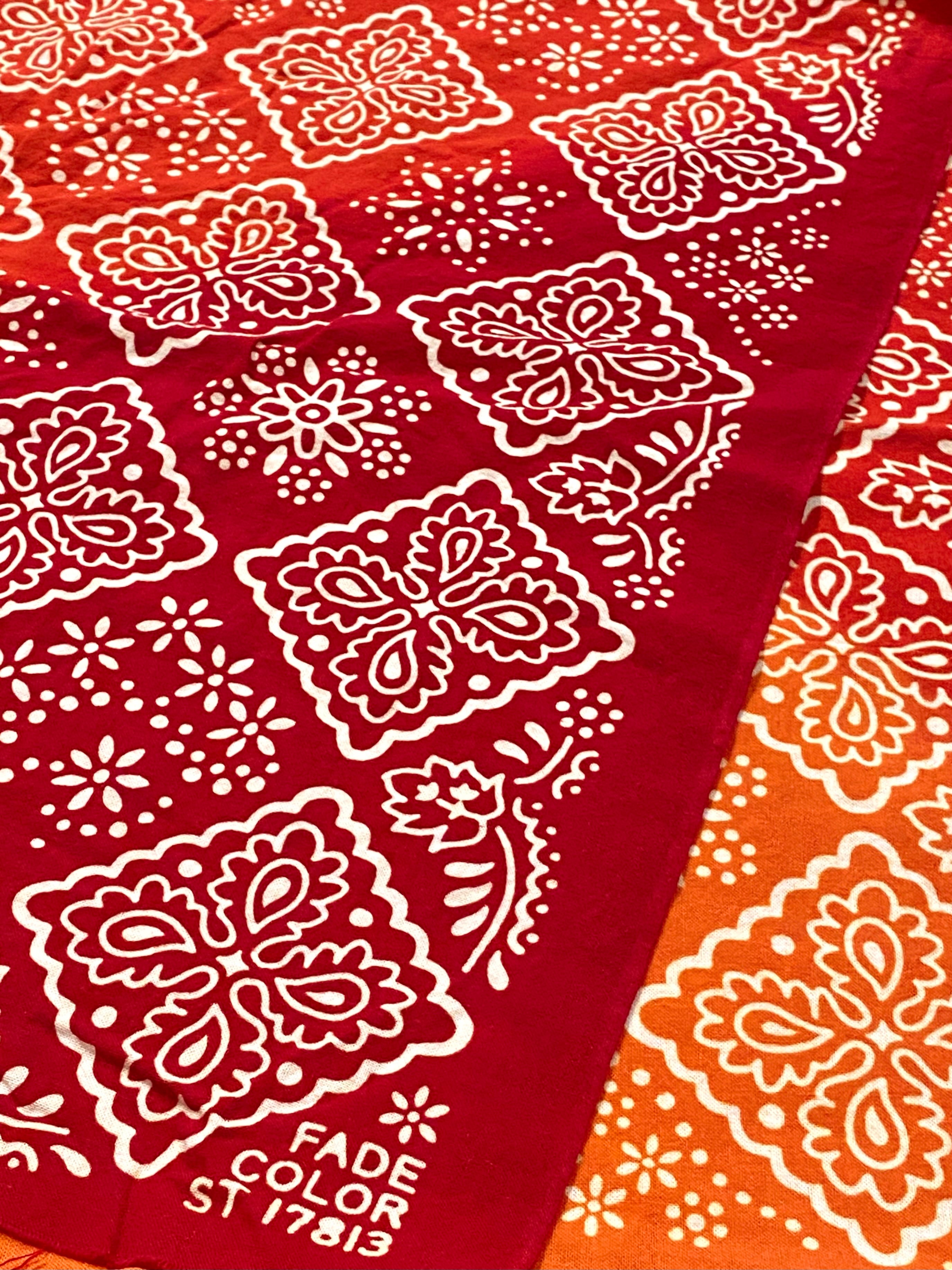 T17813「並んだクッキー」 特別色【紅茜】 青グラデに続く試みとして、秋を意識した三色のグラデーションを用いた特別なクッキー柄を製作しました。 当初は『紅グラデ』としておりましたが、秋が近づくにつれもう少しやわらかな、鮮やかさと穏やかな雰囲気を兼ね揃えた言葉をと思っていたところ、『茜』を用いることで落ち着いた赤味のニュアンスを込められると思い『紅茜』べにあかねと銘打ちました。 色の変わり目が自然なグラデーションに仕上がっております。 今回は通常使ってるやや粗めの生地から、糸が細く密に織られた徳岡生地を使用しております。 ※洗濯の際、最初の数回は色が出ます。 可能であれば手洗いで様子を見て頂き、白物、淡色の物とは分けて洗濯をお願いいたします。 洗濯ネット等にも移染の可能性がありますのでご注意下さい。 以下クッキー柄の説明です。 オールドバンダナの中で「クッキー柄」と呼ばれ、特徴的な四角形のモチーフが可愛らしい一枚を基に手ぬぐいへと再構成しました。 今回、図案としては格子柄を傾けただけの極シンプルな繰り返しのパターンを用い、全体像としての印象はプレーンなものを意識しました。 しかしながら手元で細部を見比べると微細な変化をお楽しみ頂けます。 オールドバンダナに見られる絶妙な手仕事感、イレギュラー感を表現した仕上がりです。 注染という手ぬぐいで用いる染め方をしており、使って洗ってを繰り返すごとに色が褪せ、風合いが柔らかくなります。 様々な用途で、ガンガン使ってデニムのように楽しんでいただけます! リングやブローチ、ピンで留めて首に巻くスタイルがおすすめです。 カラー:紅茜(暖色系グラデーション三色) サイズ:約35㎝×約100㎝(両端切りっぱなしのため前後します) 原産国:日本 組成:綿100% ※最初の数回は洗濯の際に色落ち、色移りする可能性がありますので、白いもの、淡色とは分けて洗うか、手洗いをおすすめします。 洗濯の条件や乾燥方法、使用頻度等で色落ちの雰囲気は十人十色です。文中の色落ち感の説明は参考程度にご理解ください。 ※注染の特性として、にじみや歪みが部分的にあるなど、個体差があります。 今回のものは生地端に滲みがありますが、染めの特性としてご理解ください。 顔料染めやシルクスクリーンにはない味わいを出したいため注染で製作しており、個体差も商品の魅力として提案しております。