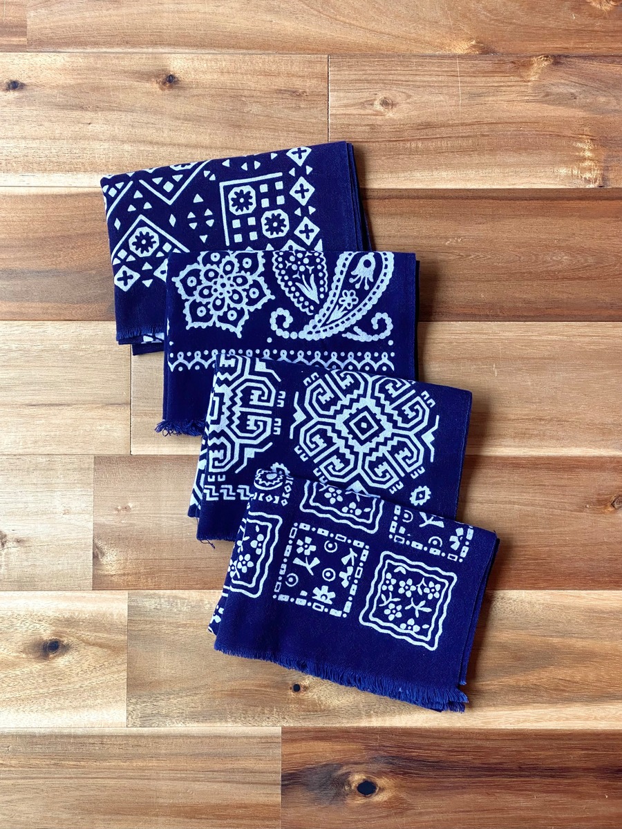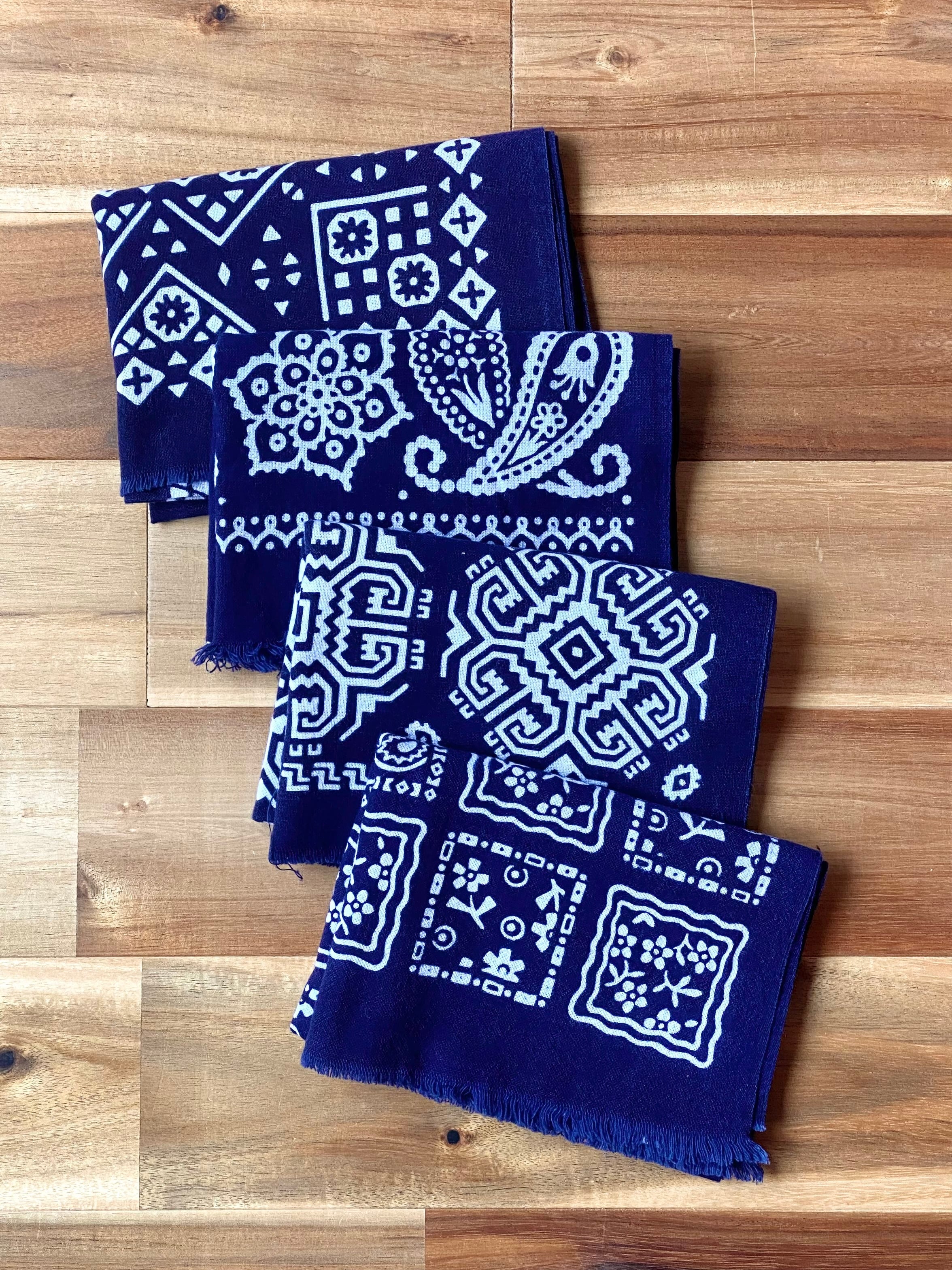 ヴィンテージバンダナを基とした図案だとひと目で分かるものを4枚組にしました。