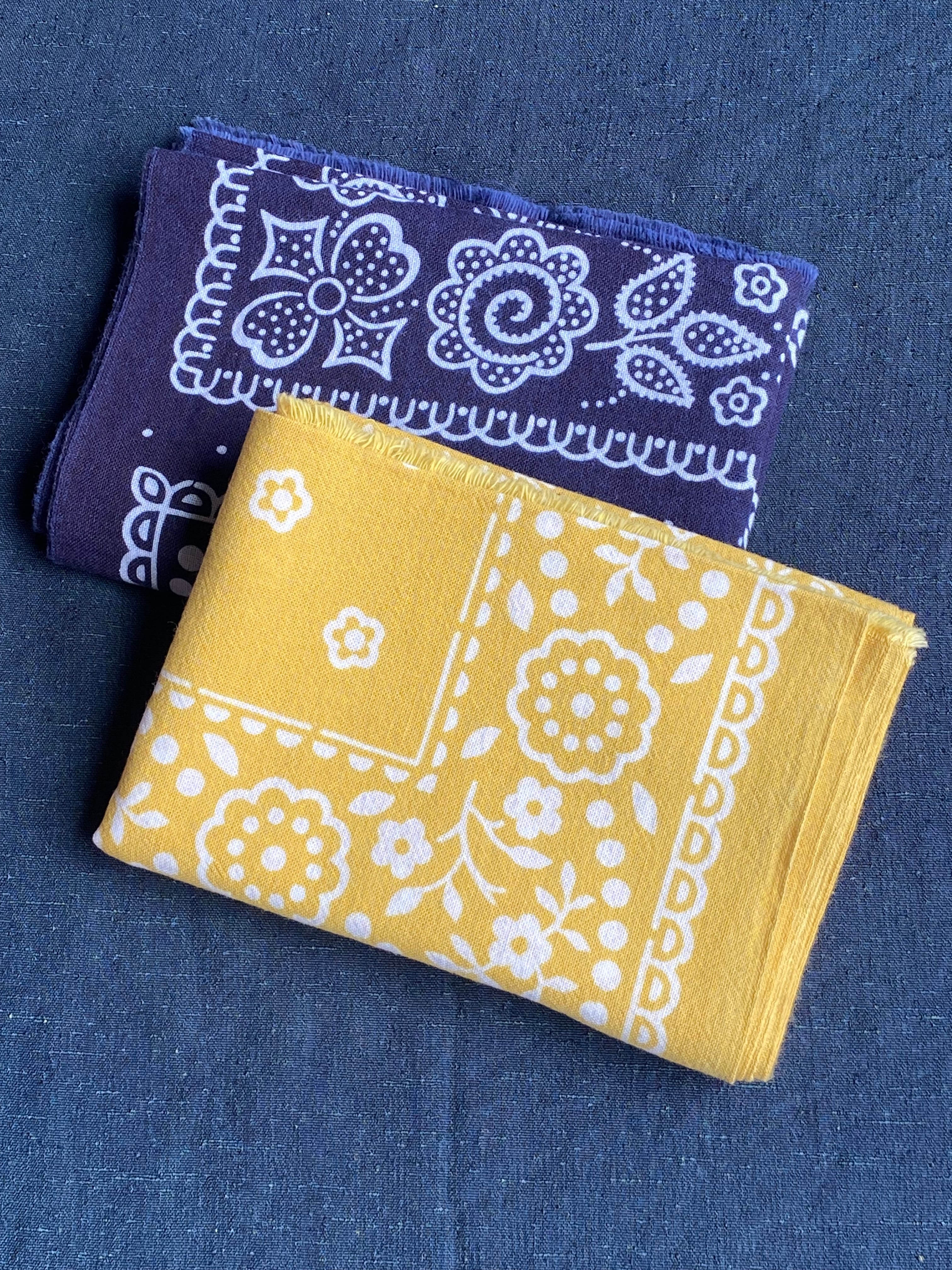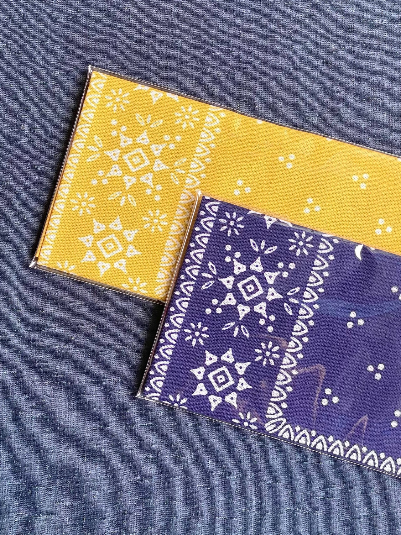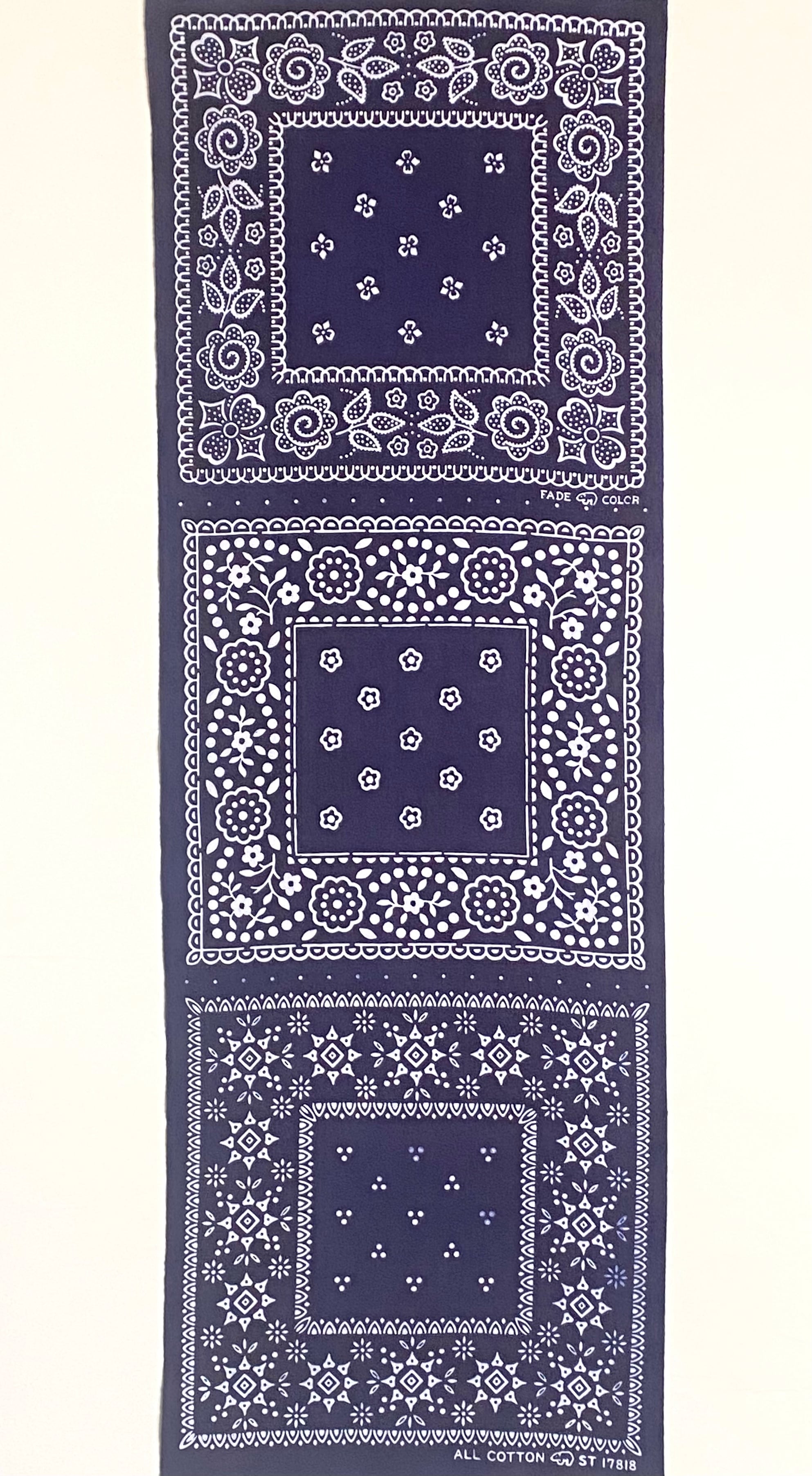 これまでもアメリカのヴィンテージバンダナをモチーフに様々な図案を作ってきましたが,これは縫製される前のバンダナ柄が連なったまま未裁断の雰囲気を一枚の手ぬぐいに落とし込みました。