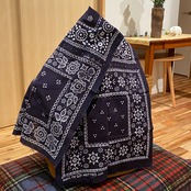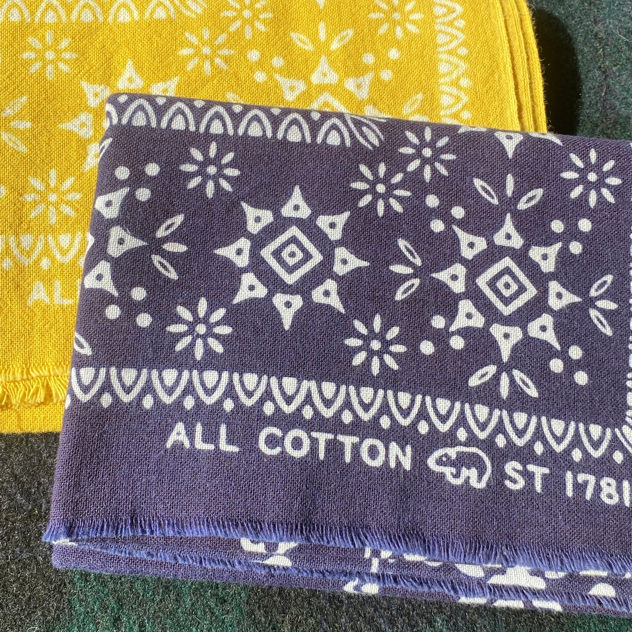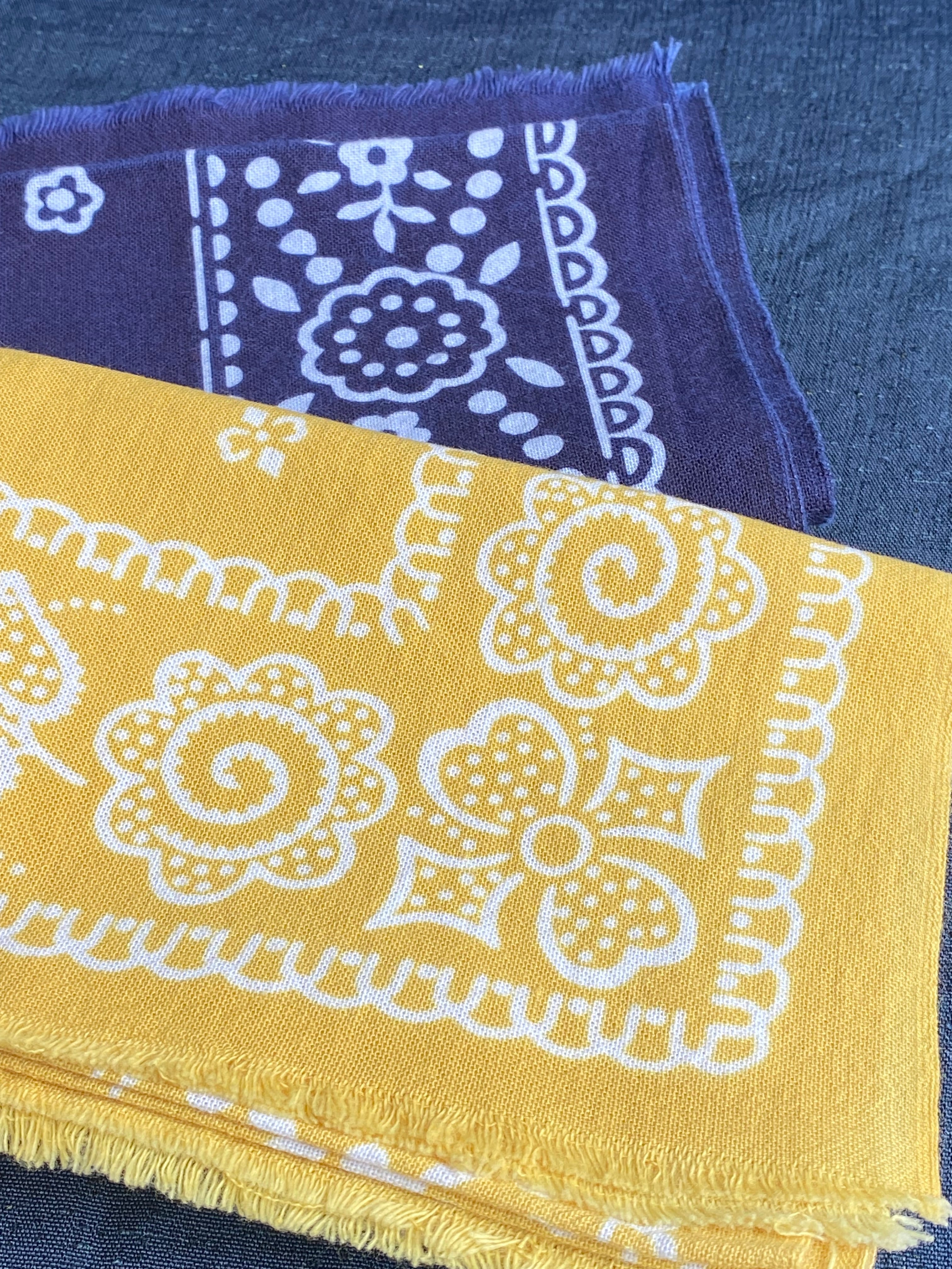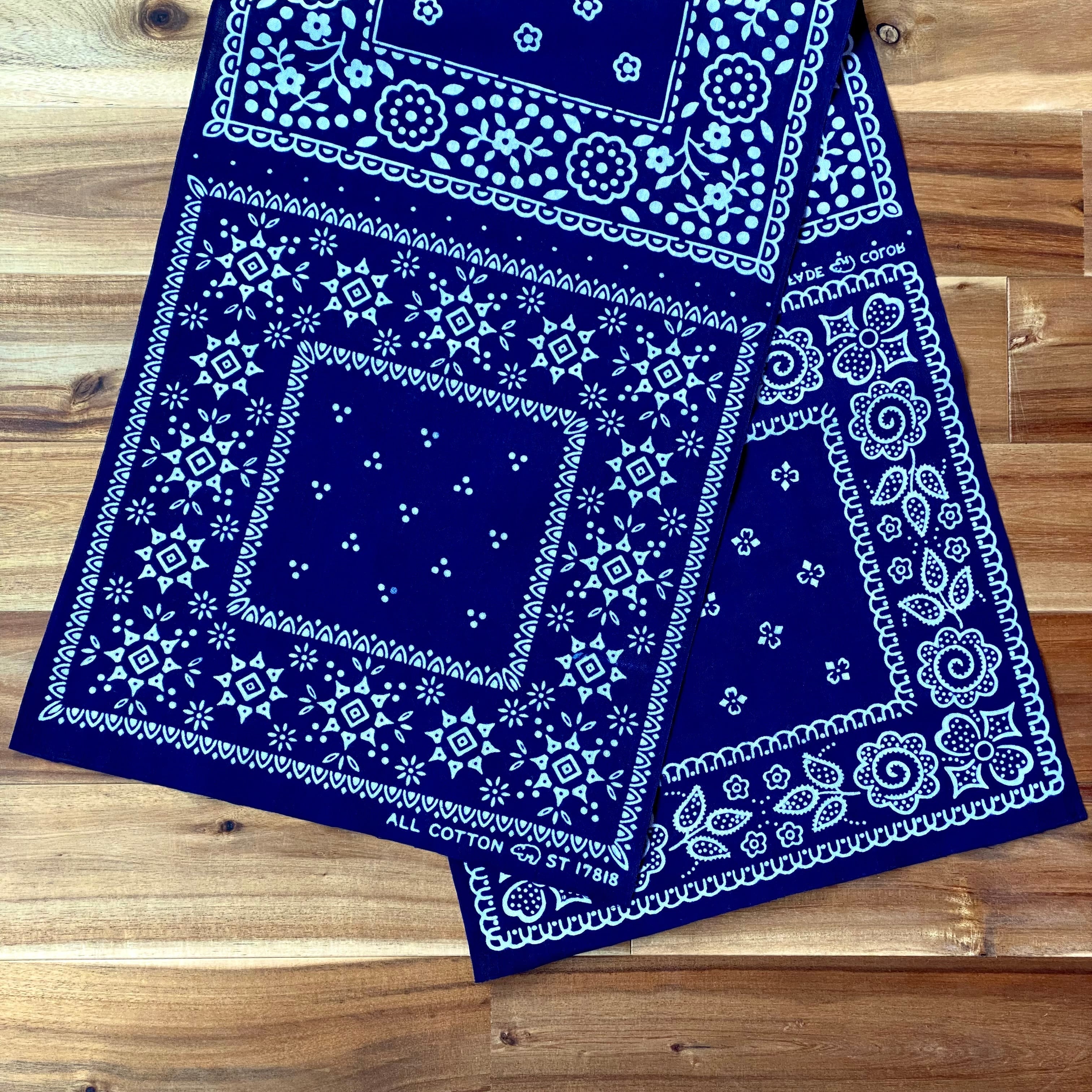 これまでもアメリカのヴィンテージバンダナをモチーフに様々な図案を作ってきましたが,これは縫製される前のバンダナ柄が連なったまま未裁断の雰囲気を一枚の手ぬぐいに落とし込みました。