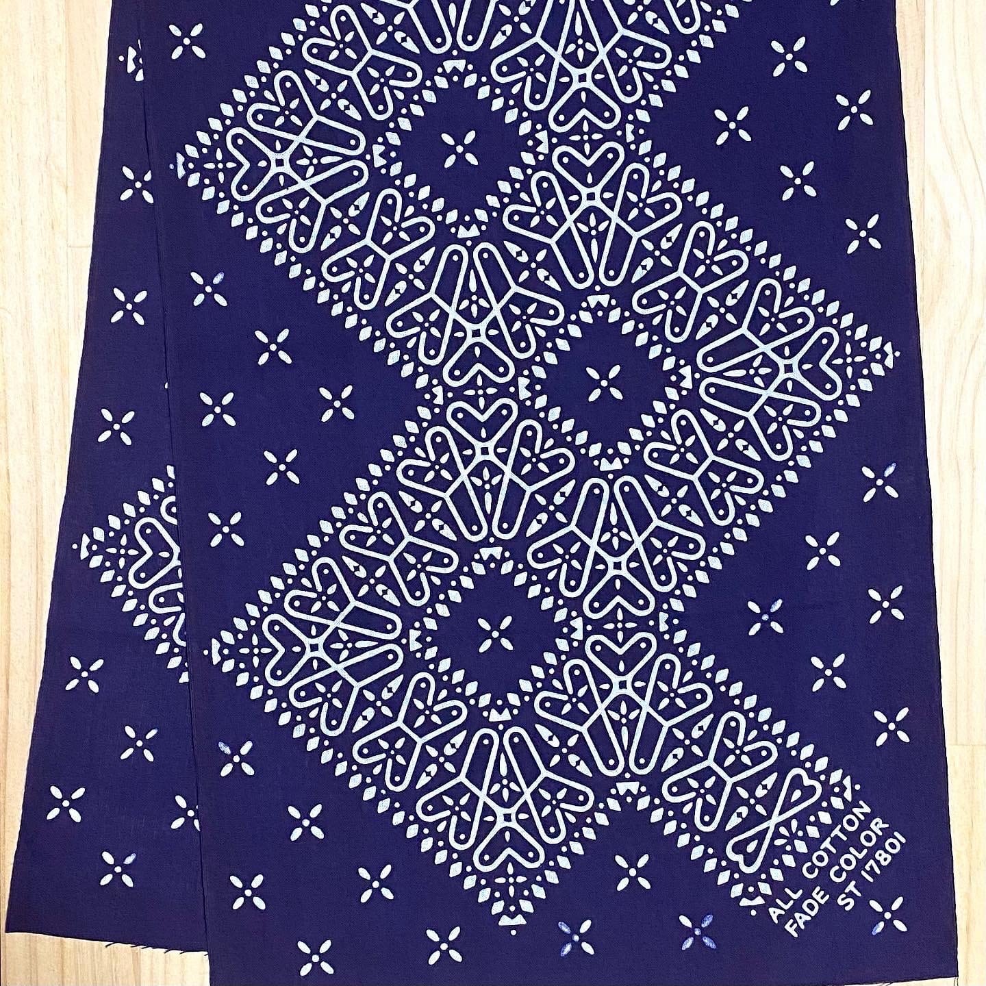 古着市場では定番柄のクロスバンダナを手ぬぐいサイズに落とし込み,新たな印象にアップデートしました.