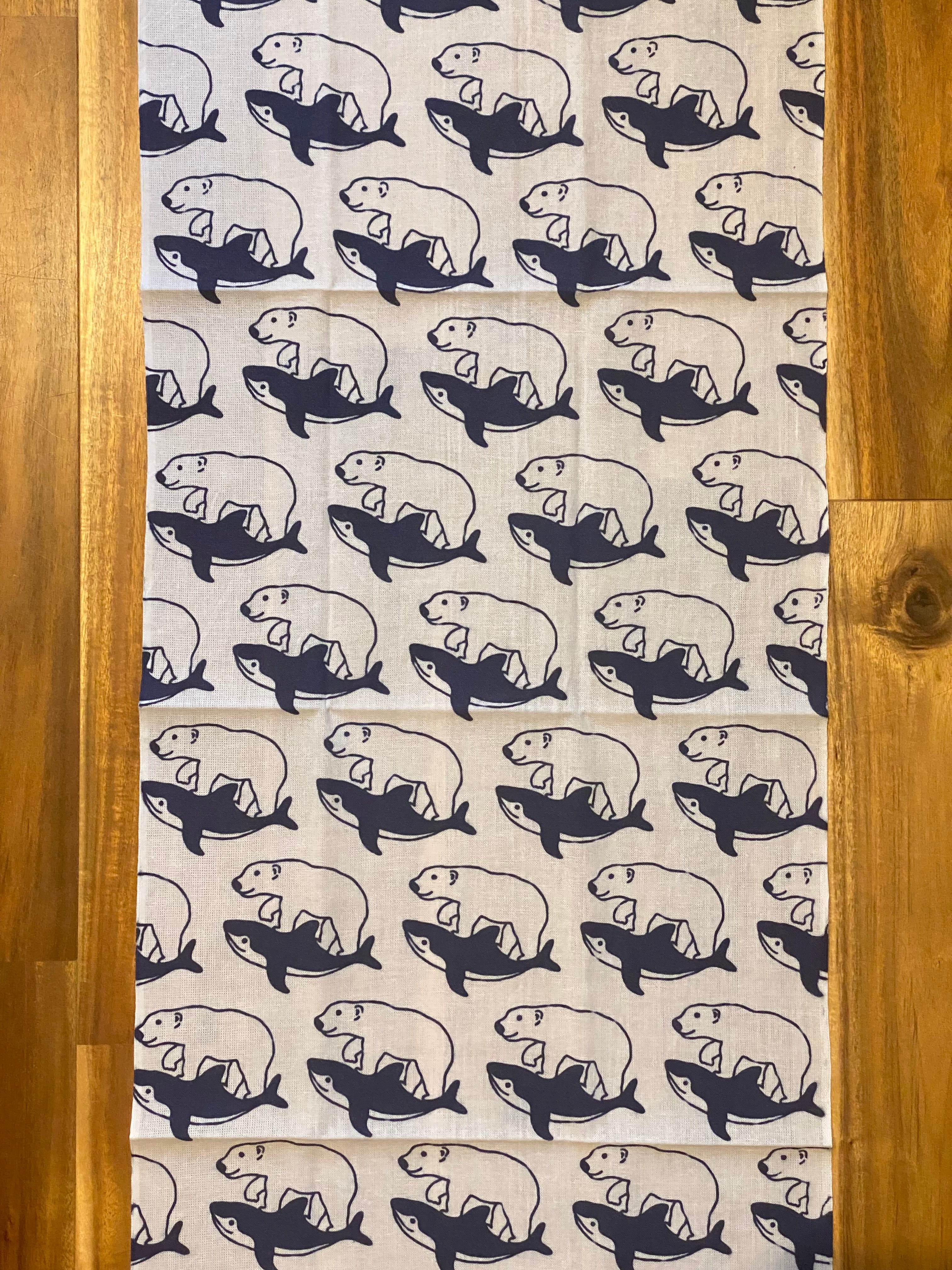 たくさんのリクエストに応え、サメとクマのロゴをまんべんなく配した手ぬぐいらしい1枚です。