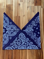 3つの異なるバンダナパターンが並んでいて、間にあるドットに沿ってカットすると約33センチ四方のハンカチサイズとしてもお使いいただけます。