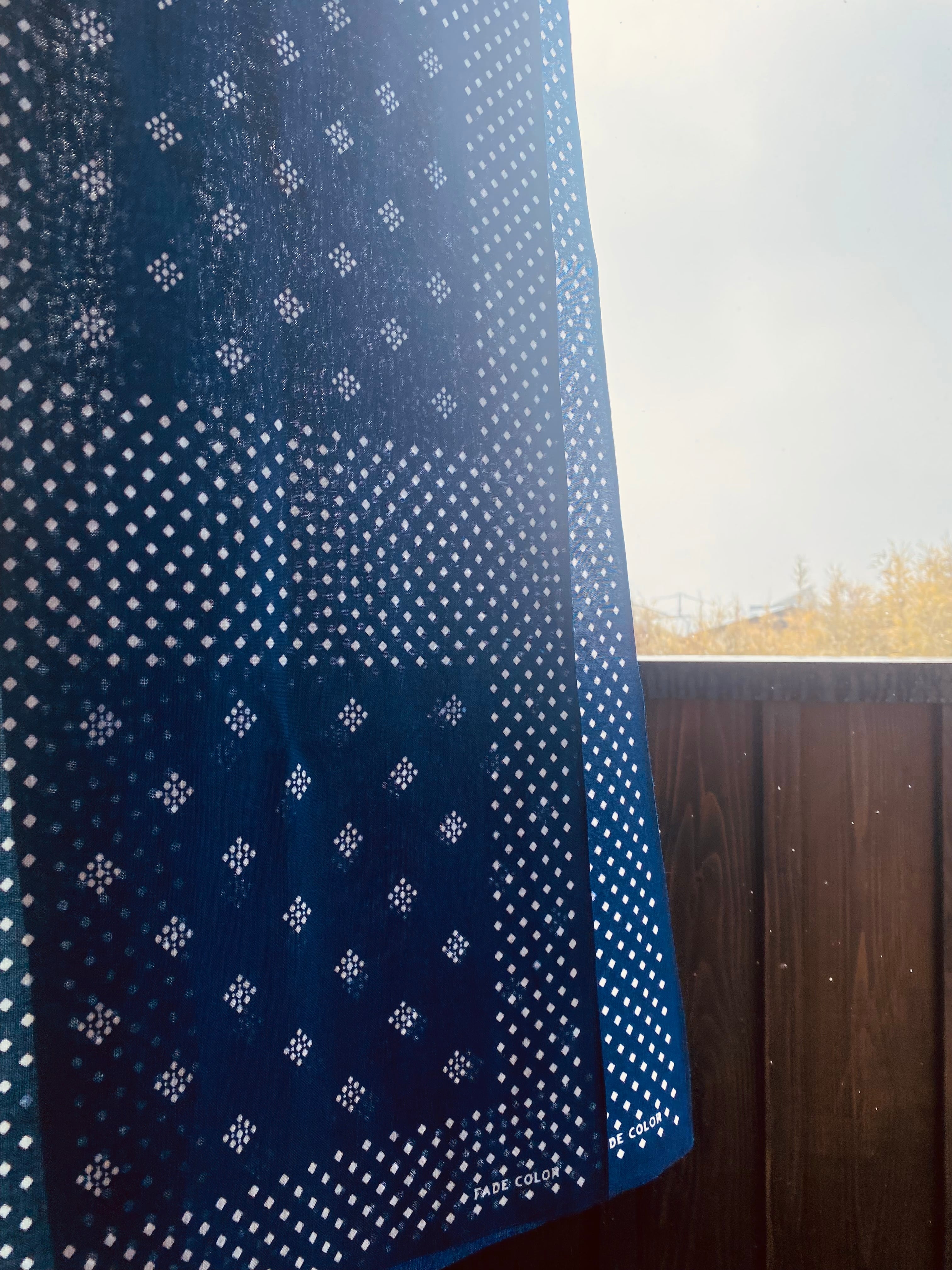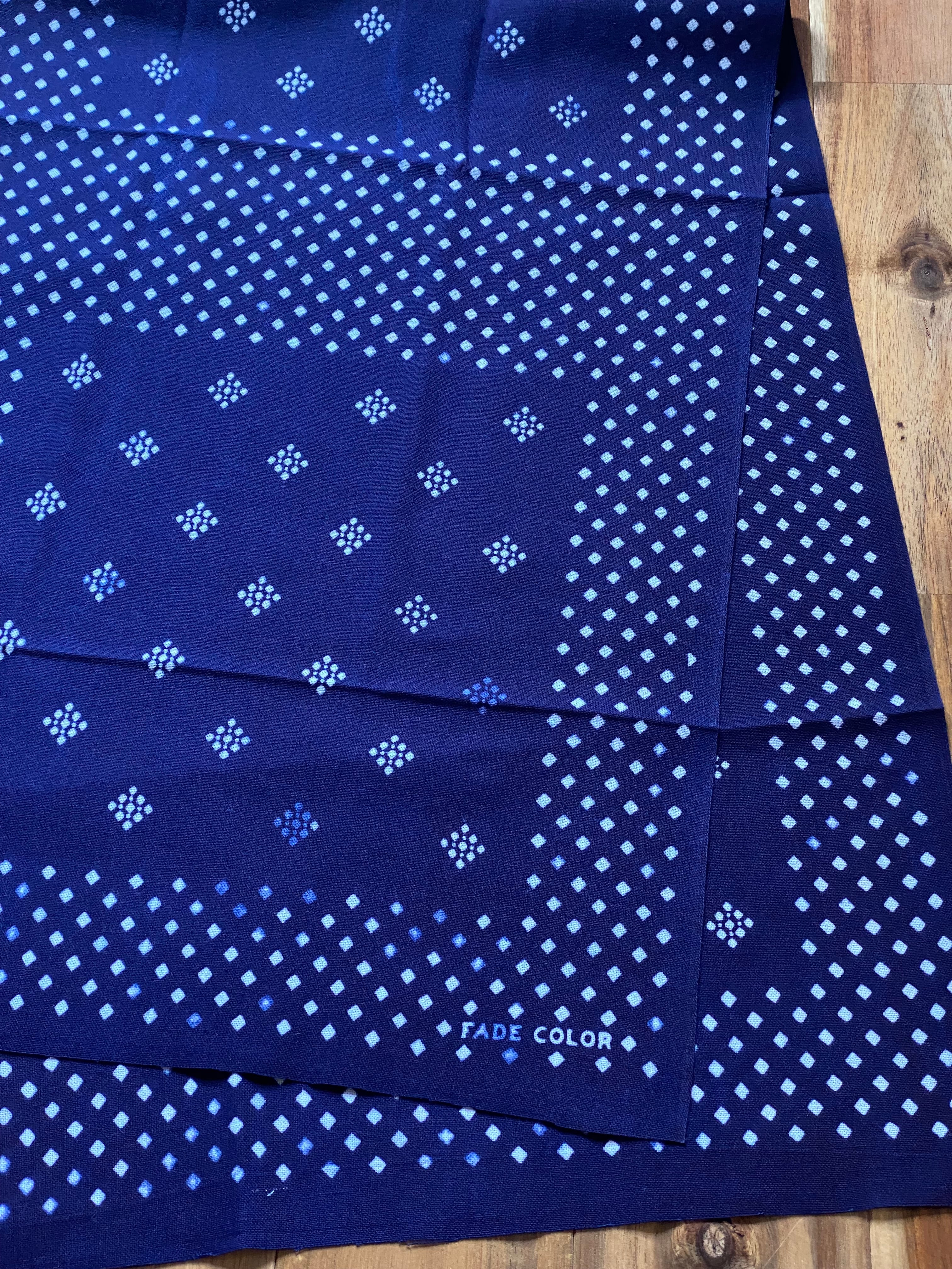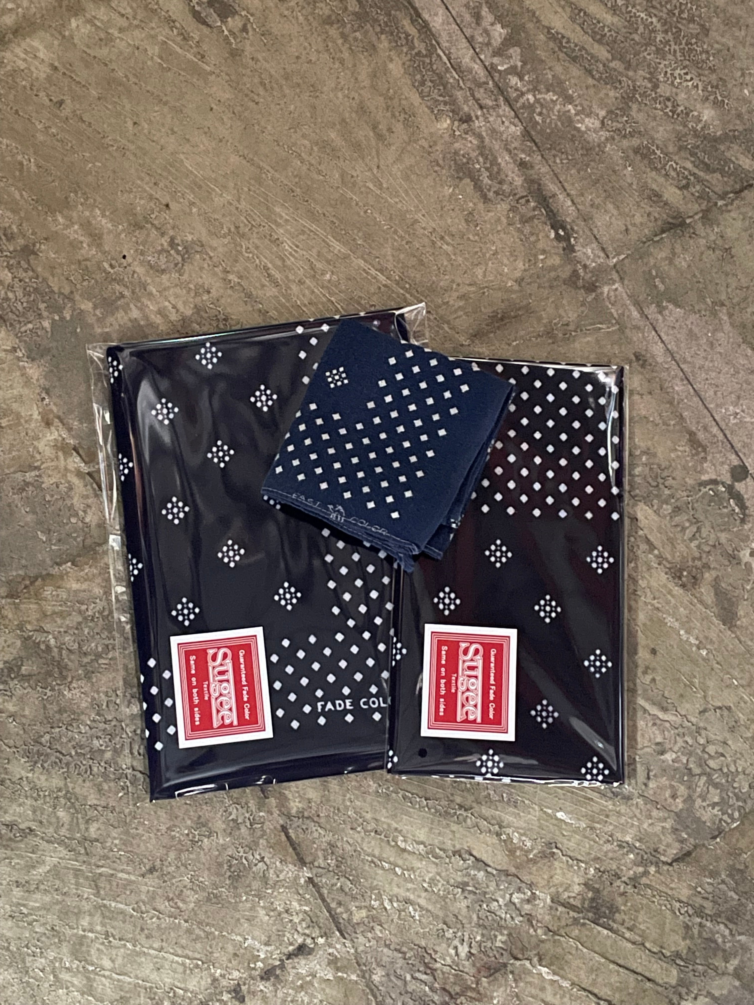 ちなみに「FADE COLOR」はオールドバンダナに見られる堅牢という意味でのFAST COLORになぞらえて、あえて色落ちをポジティブに表現する意味で表記した造語で、注染の味わい深いフェード感をお楽しみいただくために大事にしている言葉です。
