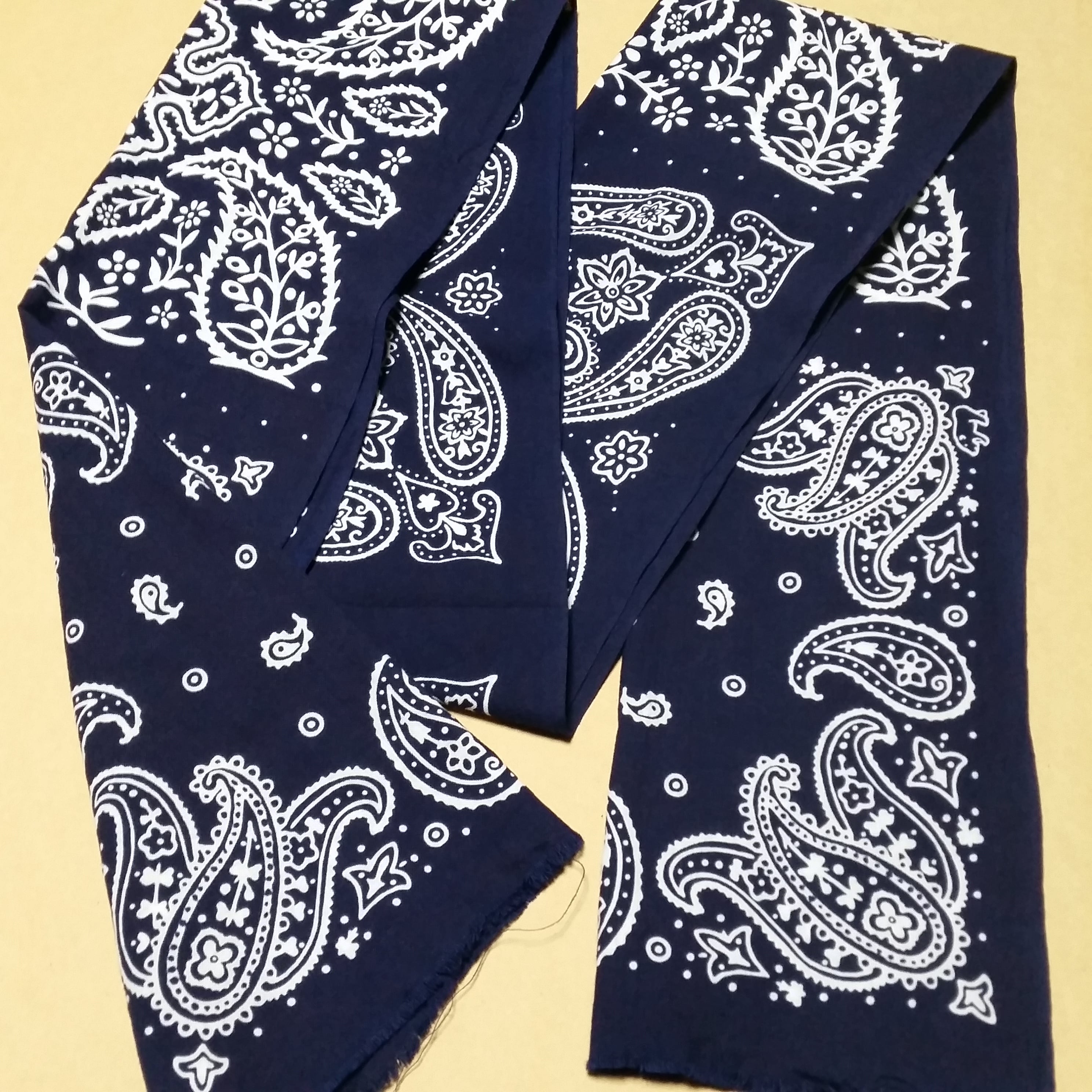 これまでもアメリカのヴィンテージバンダナをモチーフに様々な図案を作ってきましたが、以前からご希望の声が多かったペイズリー柄で図案を作り、縫製される前の未裁断の雰囲気を一枚の手ぬぐいに落とし込みました。