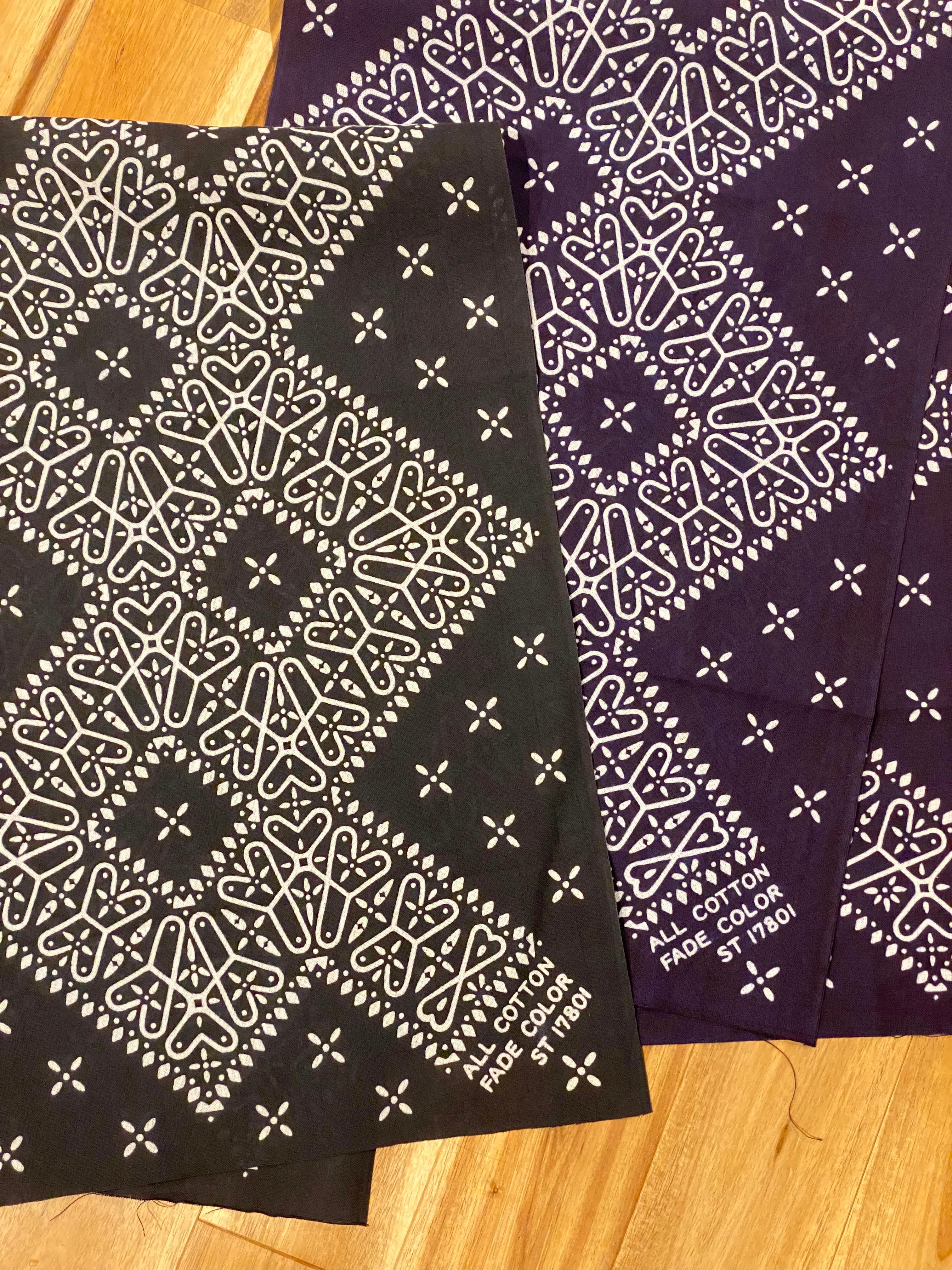 古着市場では定番柄のクロスバンダナを手ぬぐいサイズに落とし込み,新たな印象にアップデートしました.