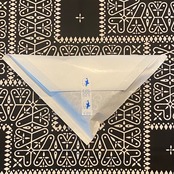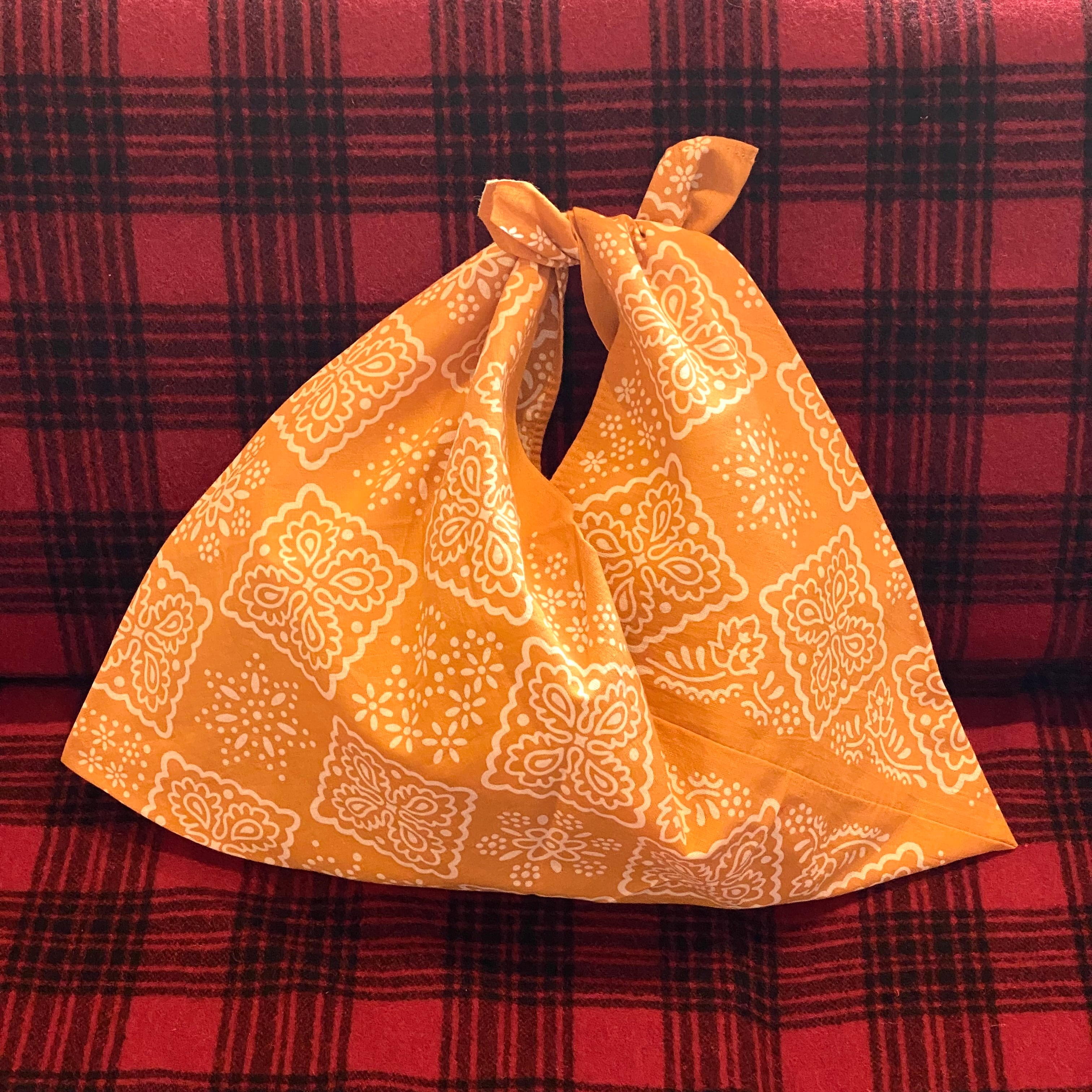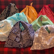 手ぬぐいを裁断することなく袋になるよう縫い合わせただけのものですが、三角の両端を結び合わせると持ち手になります。